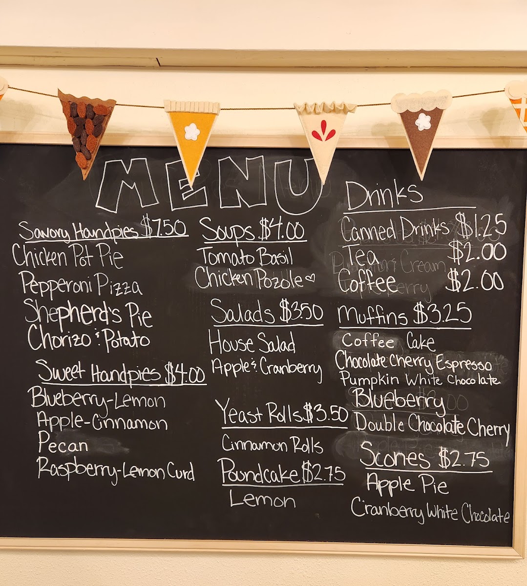 Savory Items: The menu offers multiple savory options such as Chicken Pot Pie, Shepherd's Pie, Pepperoni Pizza, Chorizo Potato, Tomato Basil, and Chicken Pozole. Hand pie varieties including Shepherd’s Pie Handpie and Chicken Pot Pie Hand Pie provide convenient choices for quick meals.